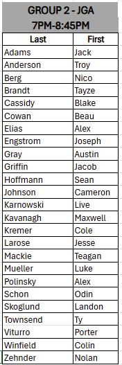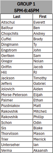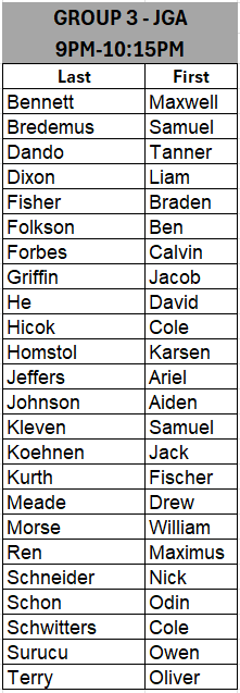 Monday Nov 16th: Group #1 (5:00pm-6:15pm), Group #2 (6:30pm-7:45pm), JGA Group #3 (8:00pm-9:15pm)