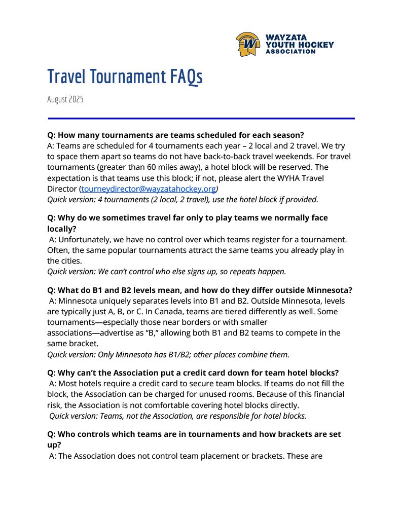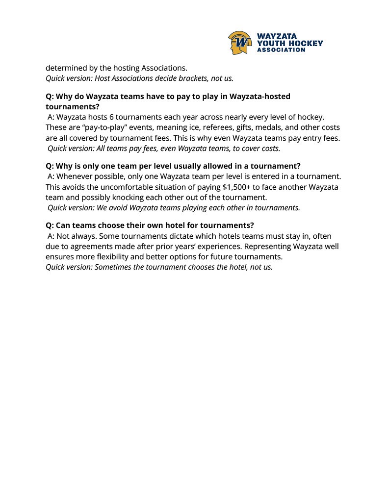 Below addresses frequently asked questions in regards to travel tournaments for Wayzata teams. If you have additional questions, please contact the Tournament Director for assistance: tourneydirector@wayzatahockey.org.