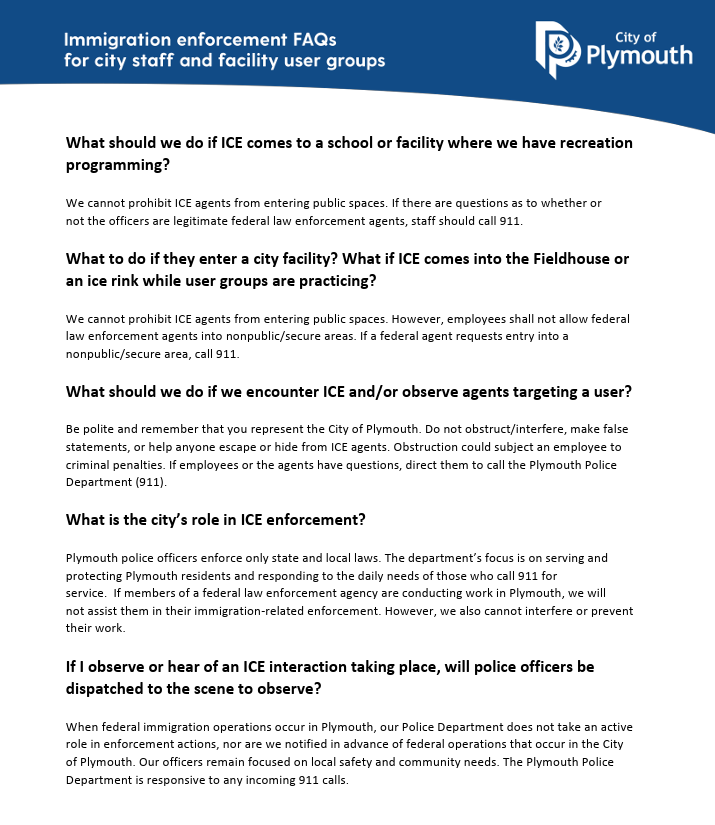 See attached document for Immigration enforcement FAQs for city staff and facility user groups, from the City of Plymouth.