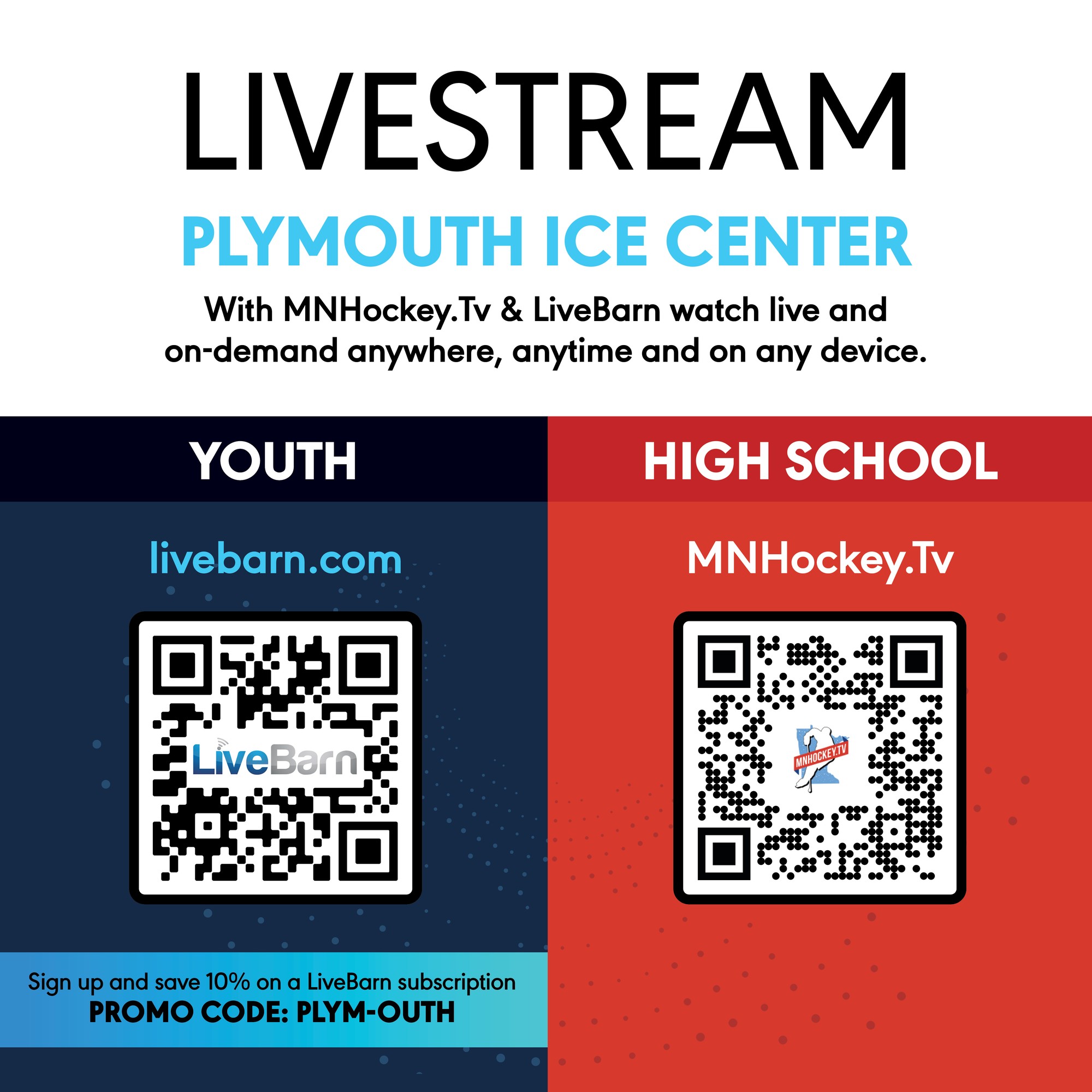 Plymouth Ice Center is a LiveBarn Venue. If you can’t make it to the facility, you can still stay connected by watching all events Live and On Demand. Share with friends and family so they never miss a moment!