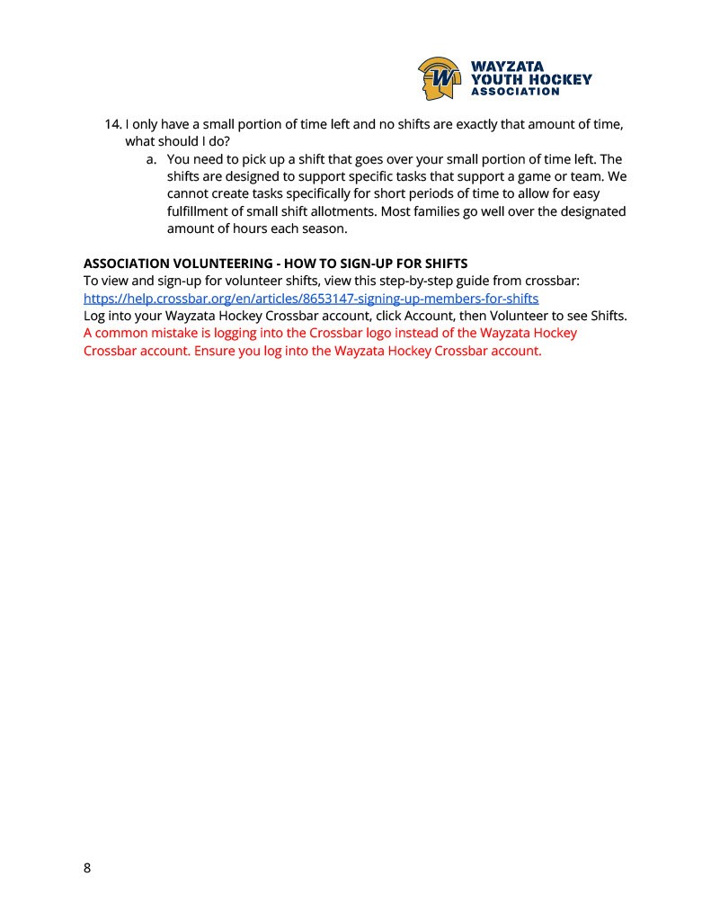 To view and sign-up for volunteer shifts log into your Wayzata Hockey Crossbar account, click Account, then Volunteer to see Shifts. A common mistake is logging into the Crossbar logo instead of the Wayzata Hockey Crossbar account. View this step-by-step guide from crossbar.