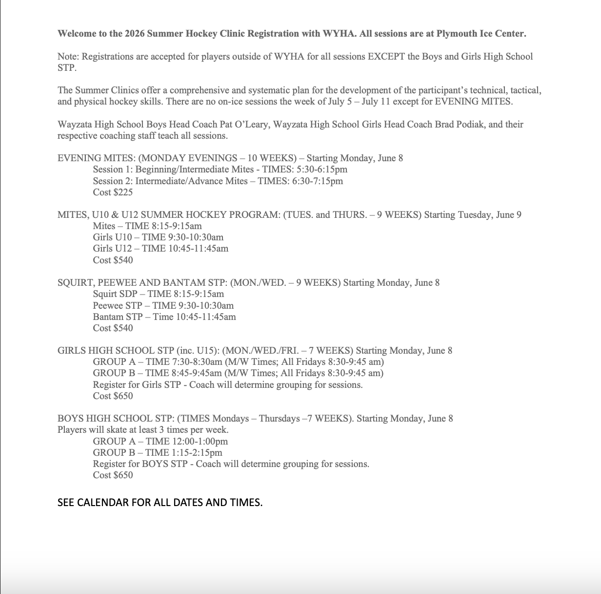 Welcome to the 2026 Summer Clinic Registration with Wayzata Youth Hockey Association.