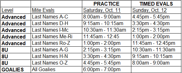 Advanced Mite/8U evaluations will be held on Saturday and Sunday, October 11 and 12, 2025.