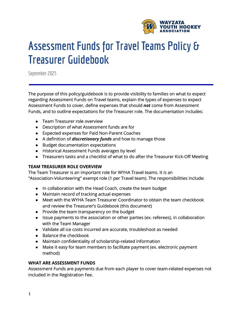 Assessment Funds for Travel Teams Policy & Treasurer Guidebook